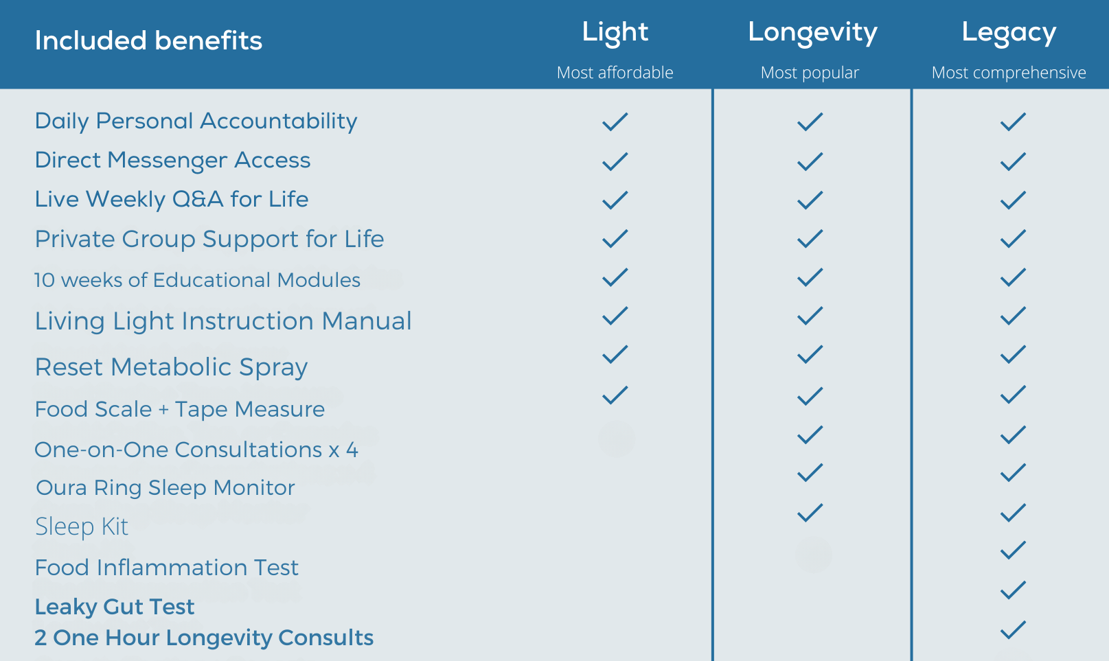 Our legacy program will include 2 one hour longevity consults to go over your test results and recommendations. You will also have a one hour consult to go over limiting beliefs and the best way to move forward.
